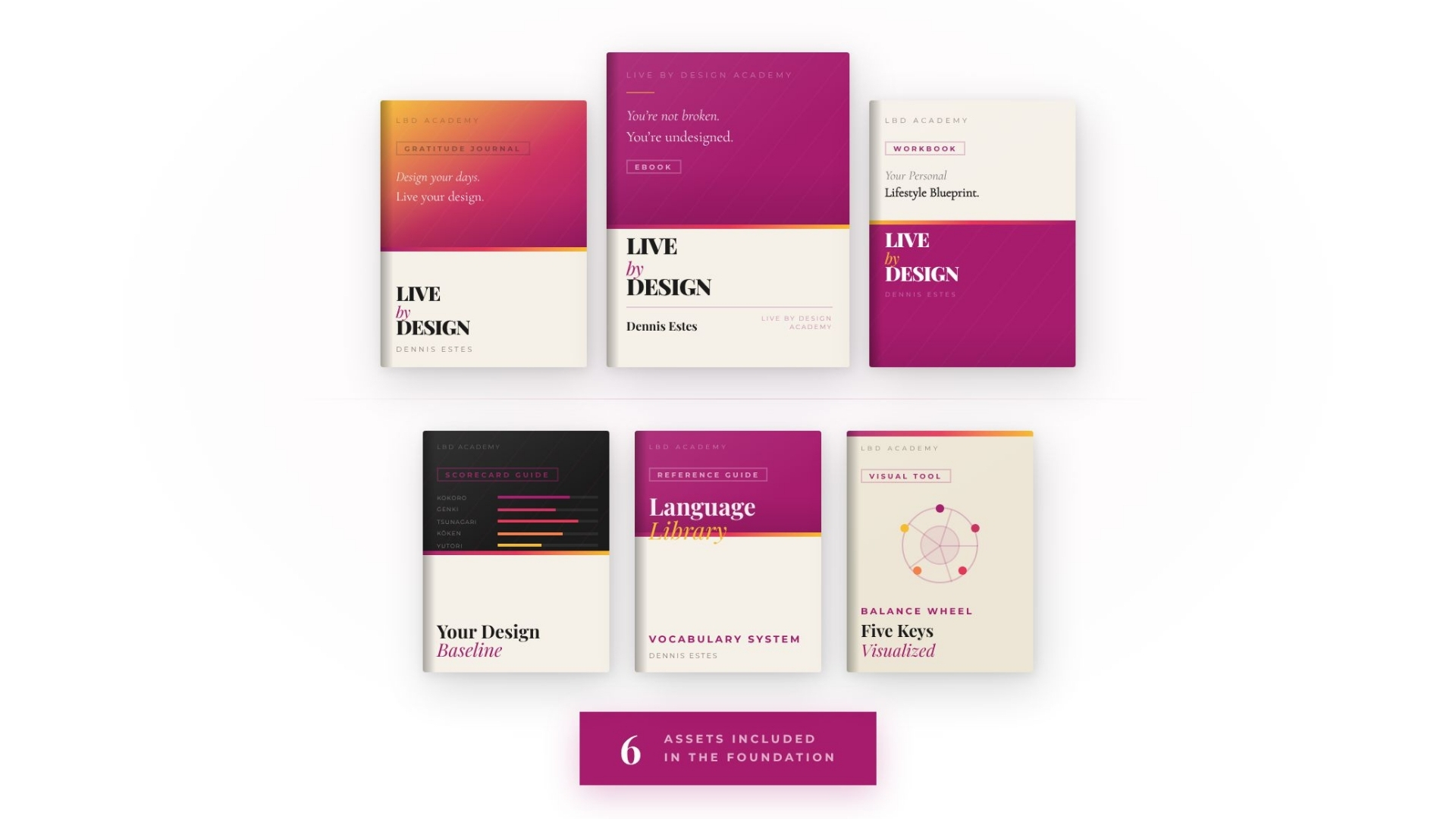 Six assets in a single investment: the eBook (awareness and authority), the Personal Lifestyle Blueprint Workbook, the Gratitude Journal, the Language Library, the Balance Wheel, and the Scorecard reference guide. This is the architecture you build everything else on.